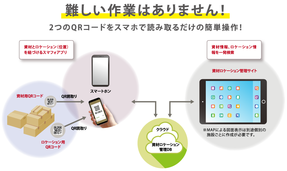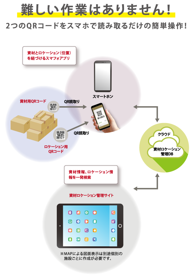 資材とロケーション(置き場)にQR コード等を張り付け、